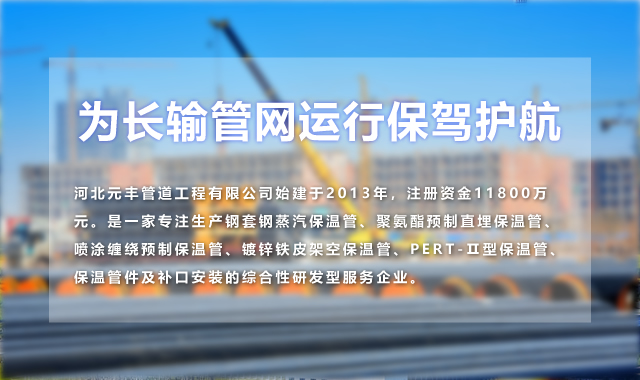 河北元豐管道工程有限公司始建于2013年,注冊(cè)資金2218萬(wàn)元。是一家專注生產(chǎn)鋼套鋼蒸汽保溫管、聚氨酯預(yù)制直埋保溫管、噴涂纏繞預(yù)制保溫管、鍍鋅鐵皮架空保溫管、PERT-Ⅱ型保溫管、保溫管件及補(bǔ)口安裝的綜合性研發(fā)型服務(wù)企業(yè)。